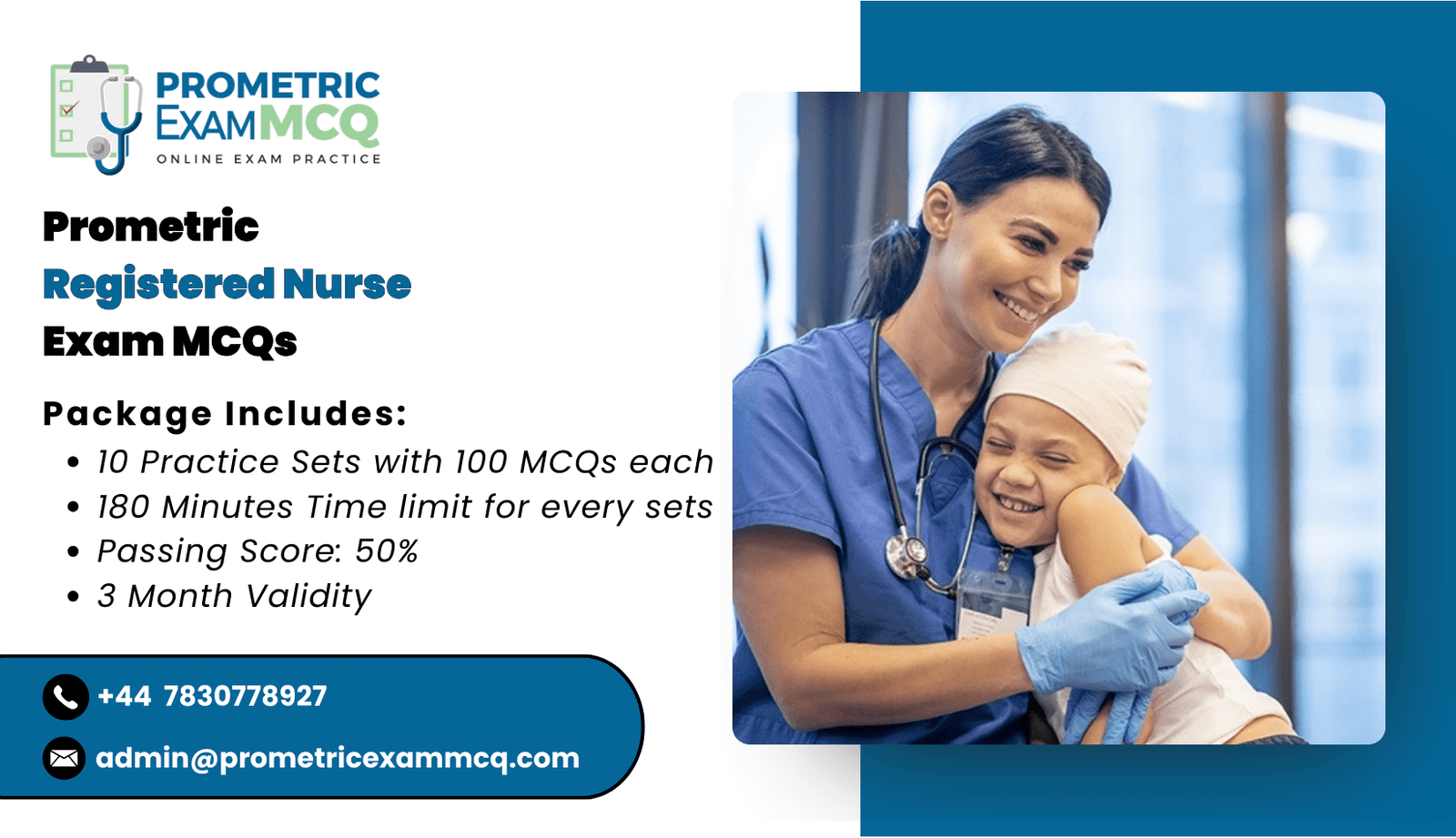 MCQs to Prepare for OMSB Registered Nurse Prometric Exam Registered Nurse Prometric MCQs consists of 10 Practice Exam Sets Each Prometric Exam Practice set contains 100 MCQs Exam Practice set have a time limit of 180 minutes Course Enrollment Validity : 3 months
